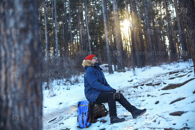 Путешественник в синей зимней куртке с красной кепкой в лесу. Песчаная бухта, озеро Байкал, зимнее время