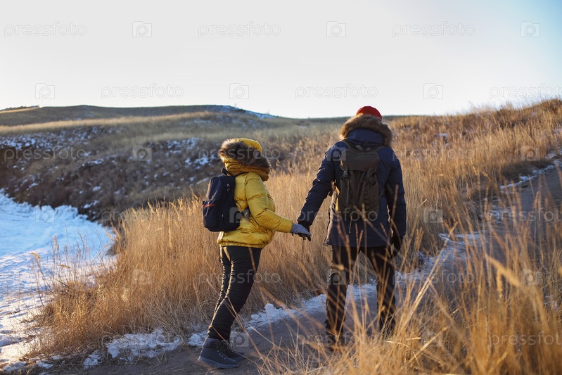 Романтическая пара туристов, одетых в теплую зимнюю спортивную одежду с туристическими рюкзаками, идущих по снегу