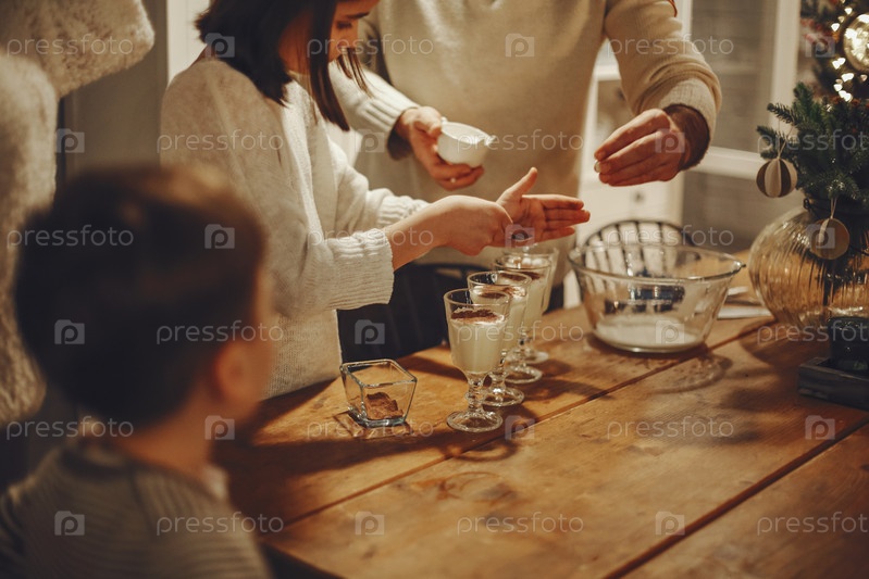 Счастливые радостные семейные родители с двумя детьми наливают домашний гоголь-моголь в стаканы, стоя за деревянным столом