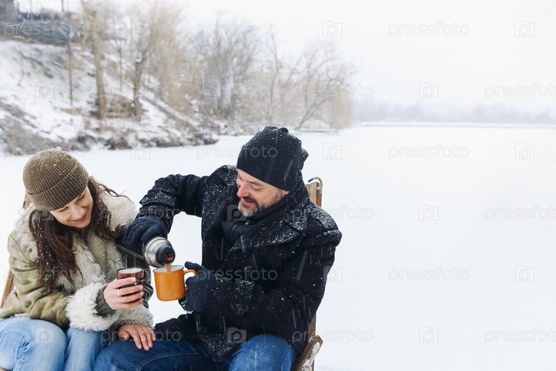 Счастливая милая пара средних лет в теплой одежде пьет горячий чай во время романтического зимнего свидания на природе, влюбленные мужчина и женщина сидят на замерзшем озере под падающим снегом и болтают в холодный морозный день