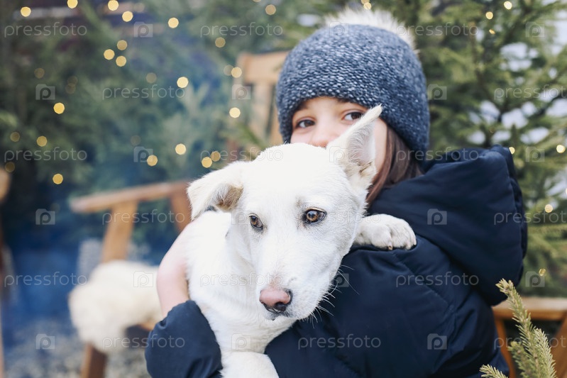 Улыбающаяся девочка-подросток в теплой одежде держит на руках милого белого щенка, сидя на заднем дворе в окружении хвойных деревьев, обнимая собаку и наслаждаясь зимней погодой в компании лучшего друга-питомца
