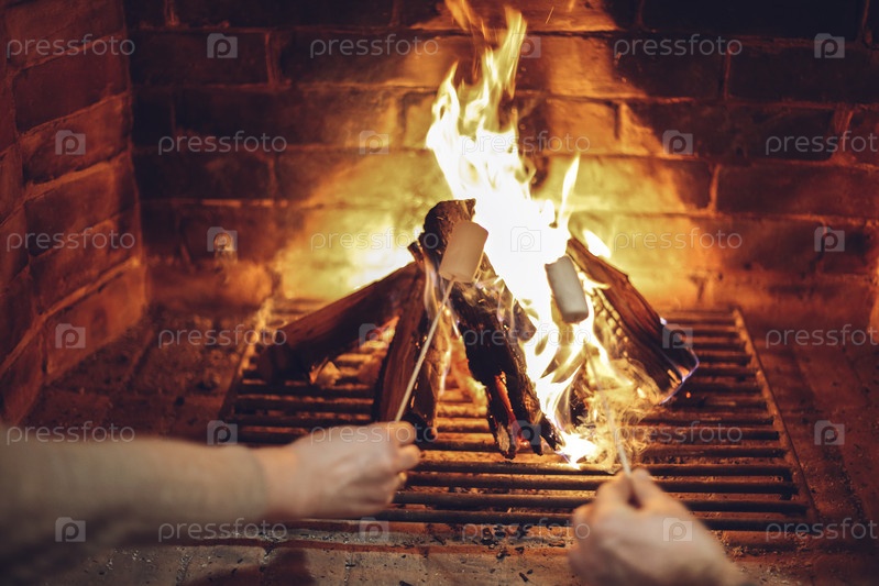 Люди поджаривают зефир на палочках для еды над камином в уютном доме во время зимних каникул