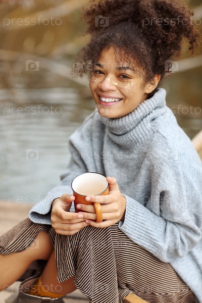 Молодая счастливая беззаботная африканская американка с чашкой горячего чая отдыхает у пруда осенью, женщина смешанной расы в теплом свитере наслаждается осенними выходными на природе