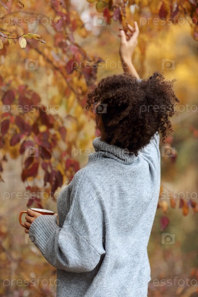 Вид сзади женщины в теплом свитере с вьющимися волосами, касающимися листа на дереве в осеннем саду или лесу,