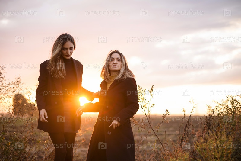 Две счастливые женщины-подружки, взявшись за руки, гуляют по осеннему полю на закате в сельской местности