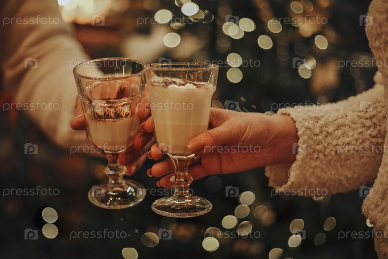 Влюбленная пара пьет домашний гоголь-моголь у рождественской елки