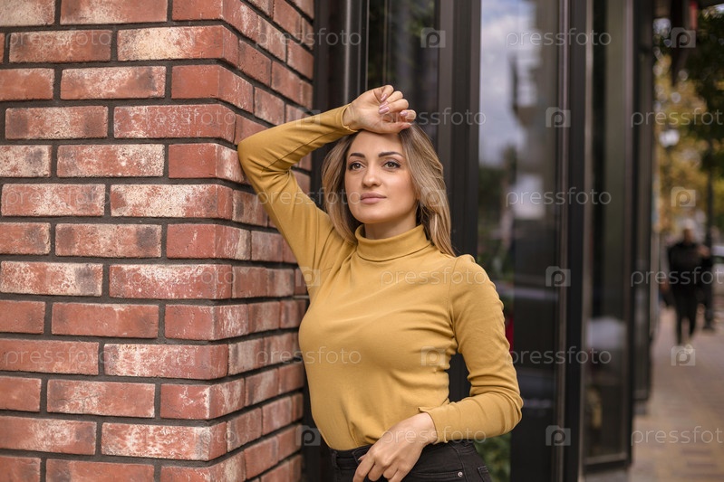 Молодая красивая стильная женщина в модной одежде стоит на пустой городской улице и смотрит в камеру