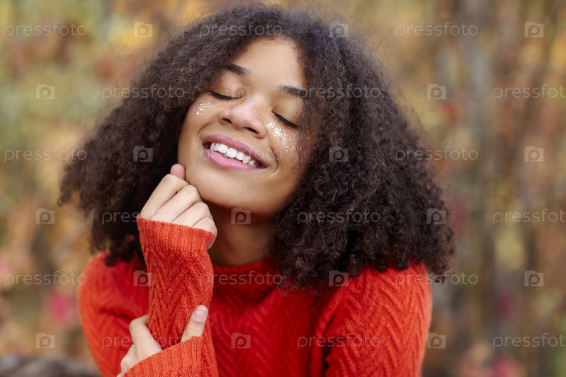 Молодая счастливая вне себя от радости африканская американка с вьющимися волосами держит глаза закрытыми, смеется и веселится, стоя в осеннем лесу