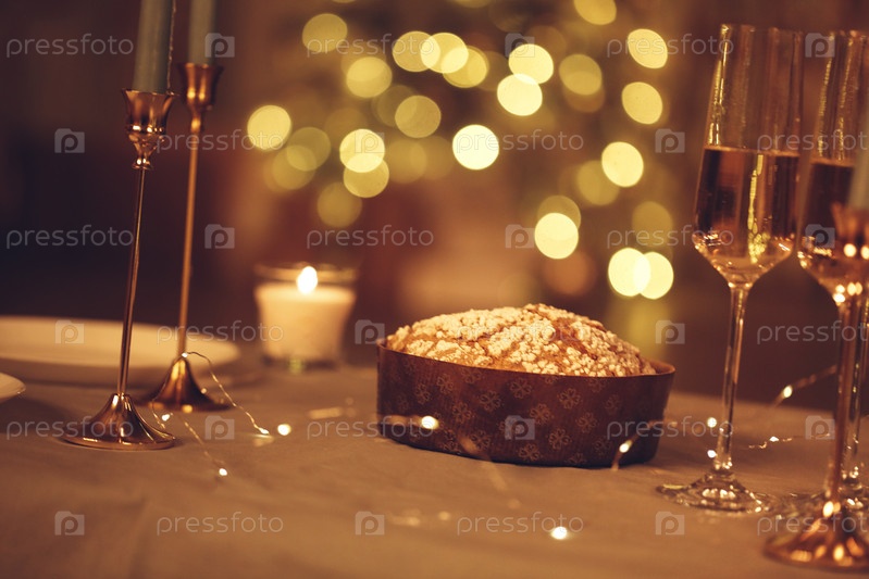 Свежеиспеченный торт панеттоне над столом подается к праздничному ужину, фото в деревенском стиле