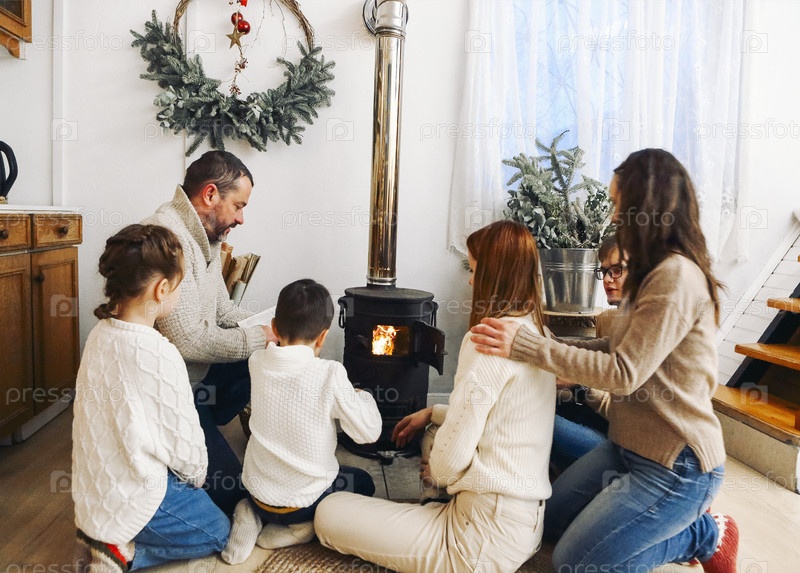 Большая семья, одетая в уютные свитера, сидит у камина в доме в горах в зимнее время