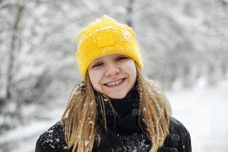 Крупный план портрета смешной счастливой девочки-подростка в желтой вязаной шапке, играющей со снегом на открытом воздухе, ребенка, держащего в руке большой снежок и показывающего его на камеру. Зимние снежные развлечения для детей на природе