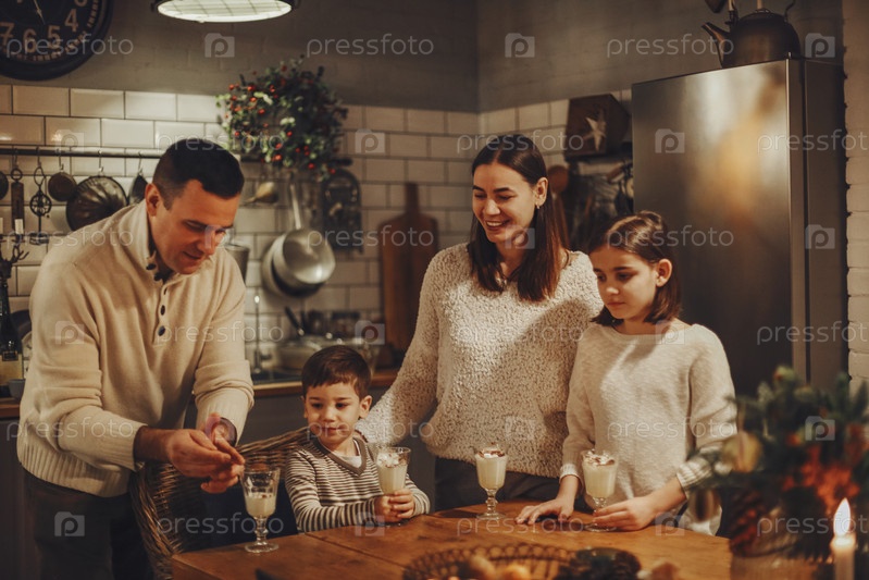 Счастливые радостные семейные родители с двумя детьми наливают домашний гоголь-моголь в стаканы, стоя вместе за деревянным столом и готовя на уютной деревенской кухне во время зимних каникул