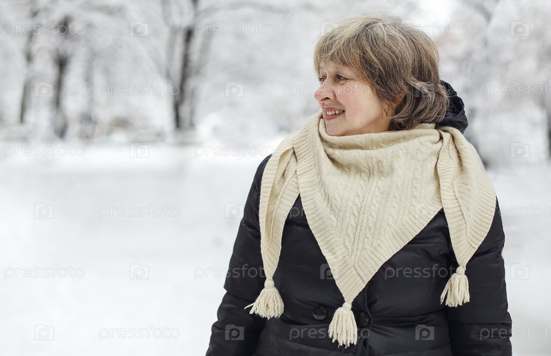 Портрет счастливой, довольной морозной снежной погодой пожилой женщины в теплой одежде, улыбающейся в камеру, стоящей в зимнем парке на открытом воздухе во время ежедневной прогулки, избирательный фокус. Рождество, новогодние праздники