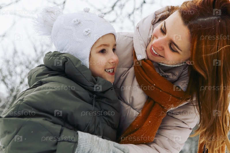 Прекрасная счастливая семейная мать и маленькая дочь веселятся в снежную погоду на открытом воздухе
