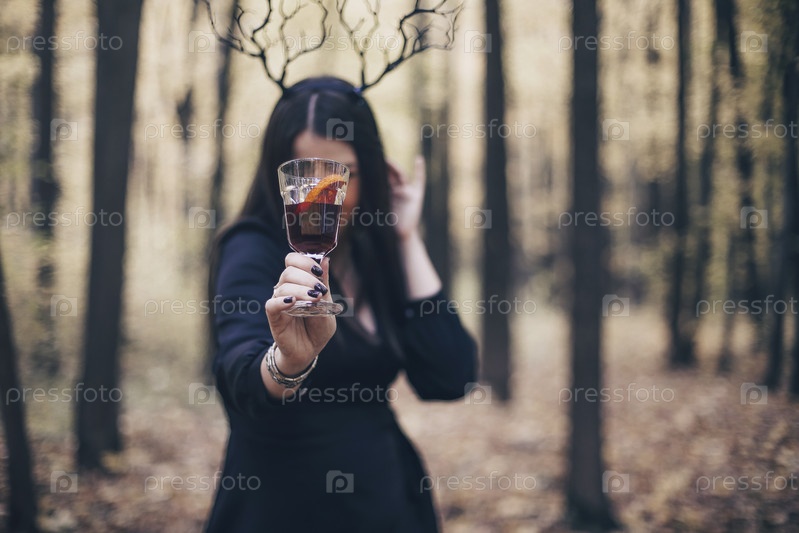 Таинственная женщина в осеннем лесу в готической повязке с рогами оленя держит глинтвейн