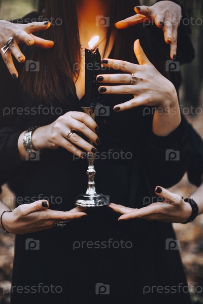 Ведьма с горящей свечой, к которой прикасаются многие руки во время магического ритуала в темном осеннем лесу