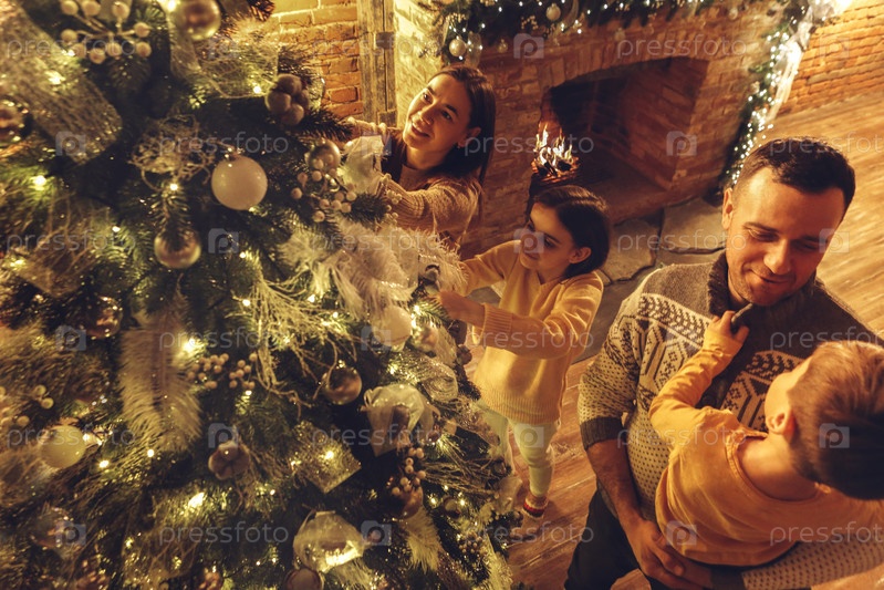 Молодая счастливая европейская семья с двумя детьми готовит дом к празднованию Нового года. Родители с маленькими детьми украшают елку
