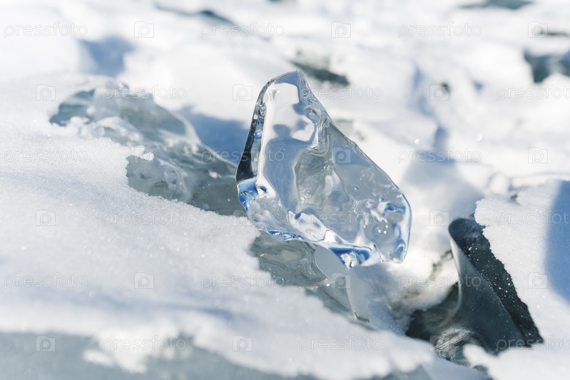 Кусочки льда, лежащие на идеально гладком льду байкала с ледяными торосами на горизонте