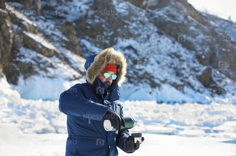 Мужчина в синей куртке выливает кипяток из термоса, который превращается в ореол шара над ее головой