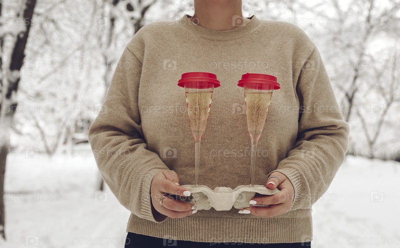 Счастливая женщина в теплой одежде с двумя бокалами шампанского, стоя в заснеженном дворе