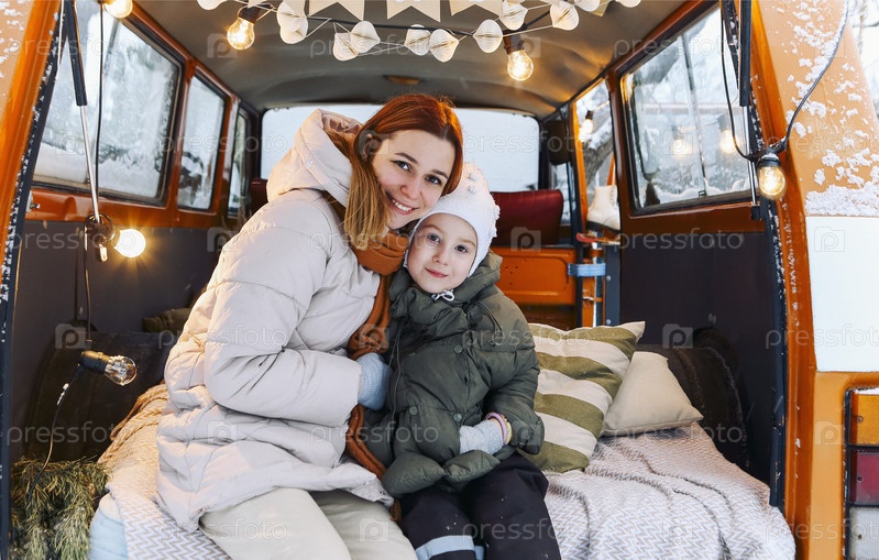 Прекрасная фотография молодой счастливой матери с маленькой дочерью в теплой одежде, обнимающейся
