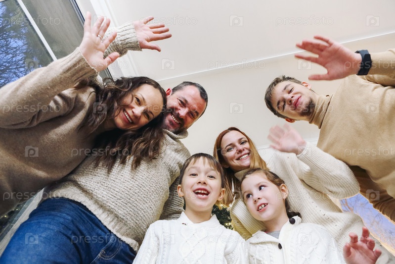 Счастливая большая семья со многими детьми делает селфи фото дома, машет руками в камеру