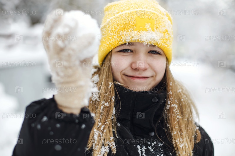 Портрет смешной счастливой девочки-подростка в желтой вязаной шапке со снегом на открытом воздухе