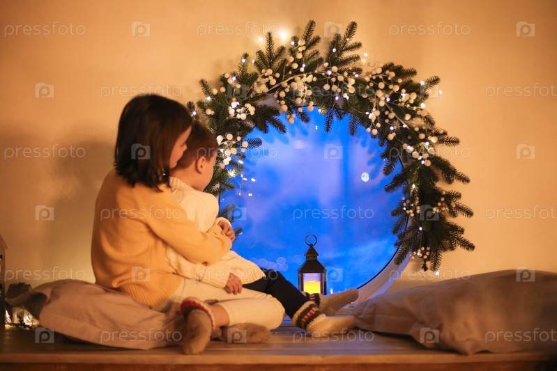 Милые маленькие дети ждут чуда в канун Рождества, дети смотрят в окно рождественским вечером