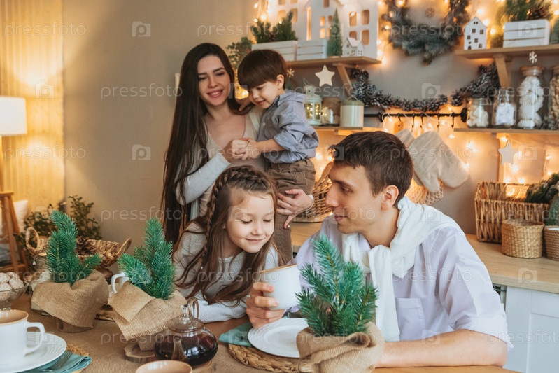 Молодая счастливая европейская семья с детьми вместе наслаждается рождественскими праздниками в уютной домашней атмосфере