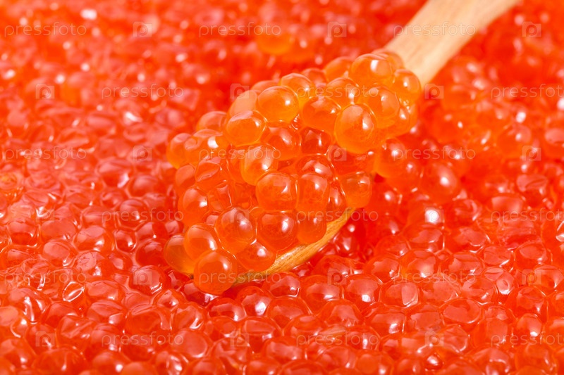 Маленькая деревянная ложка в соленой красной икре крупным планом
