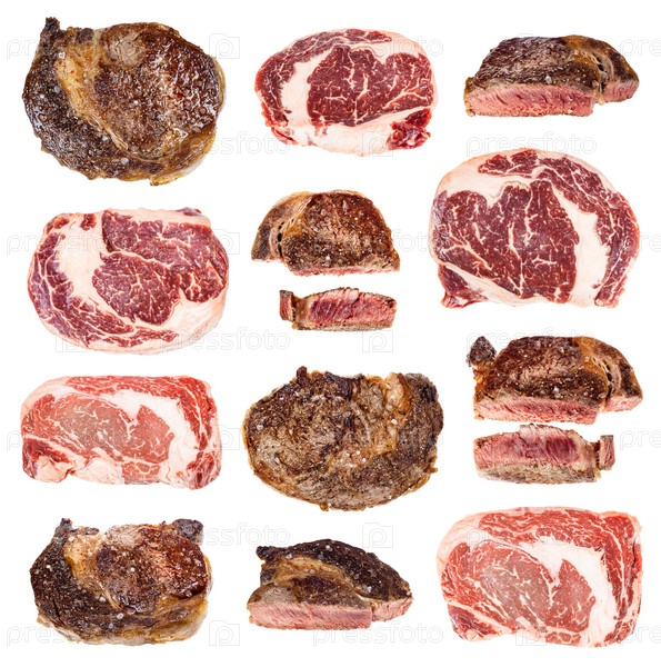 Набор различных приготовленных и сырых стейков из говяжьей вырезки