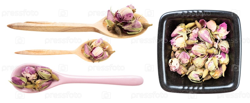 Набор различных сушеных бутонов роз, изолированных на белом