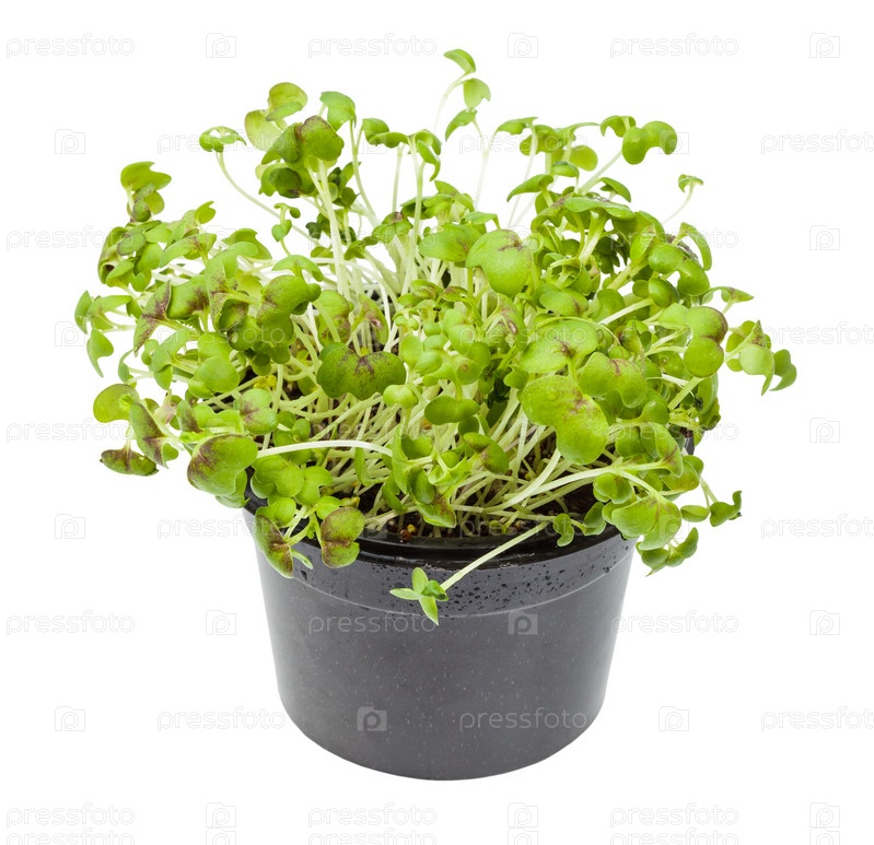 Живой зеленый горчичный кресс-салат в изолированном горшке