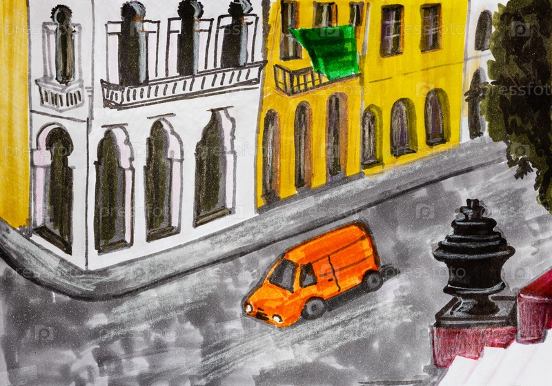 Городской пейзаж с оранжевым автомобилем на дороге возле отеля