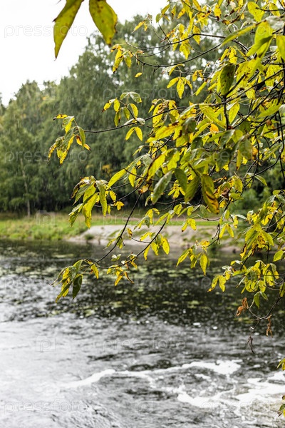 Веточка с пожелтевшими осенними листьями над городским прудом