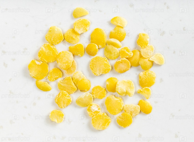 Несколько сырых расколотых желтых чечевиц крупным планом на сером
