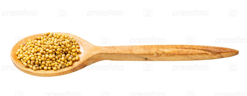 Деревянная ложка с желтыми семенами горчицы изолирована
