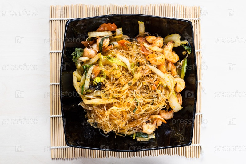 Вид сверху на жареную стеклянную лапшу Mien Xao wok
