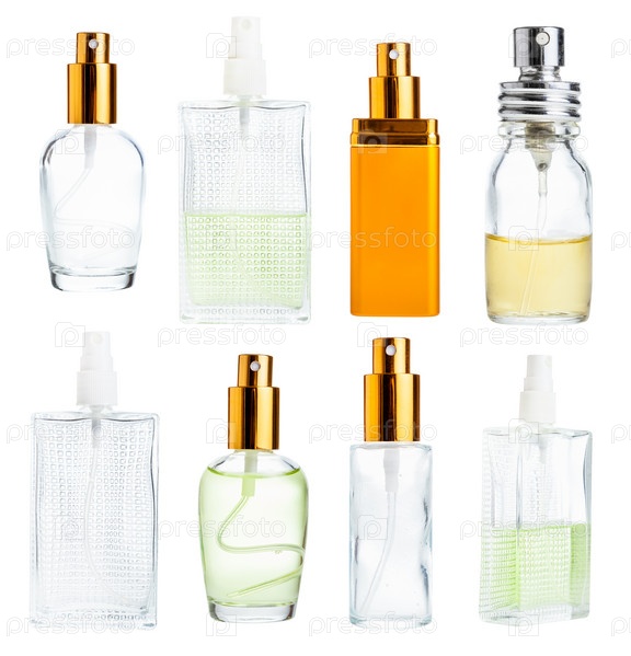 Набор различных парфюмерных стеклянных флаконов, изолированных