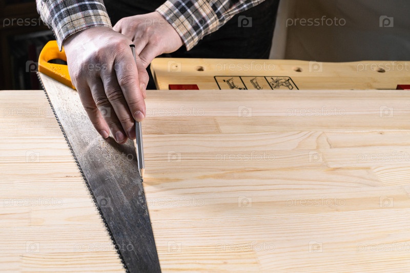Плотник рисует линию резки карандашом на доске