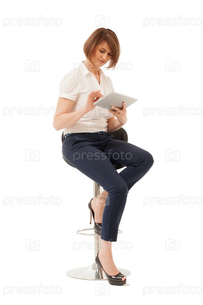 Деловая женщина с помощью планшета, сидя на стуле