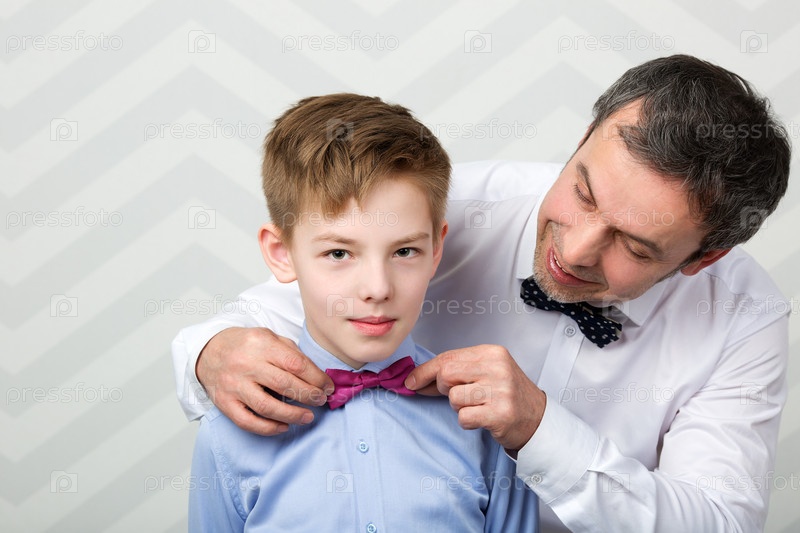 Отец поправляет бабочку сына