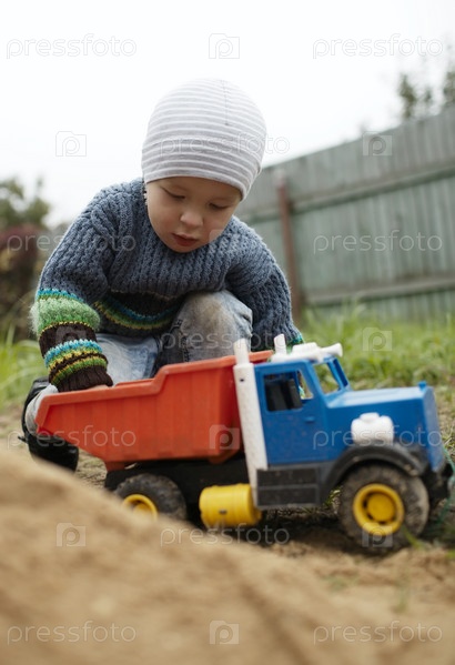 Мальчик играет с игрушечным грузовиком на улице
