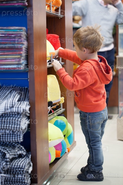 Милый маленький мальчик покупает пляжные аксессуары