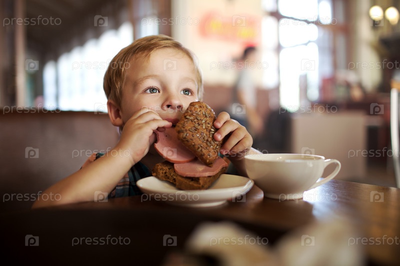 Маленький ребенок обедает с бутербродом и чаем в кафе