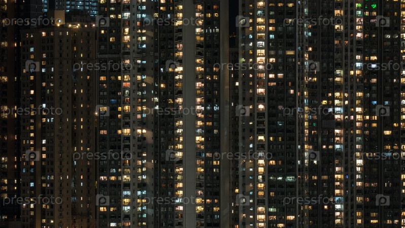 Оконные огни в многоэтажном жилом доме ночью