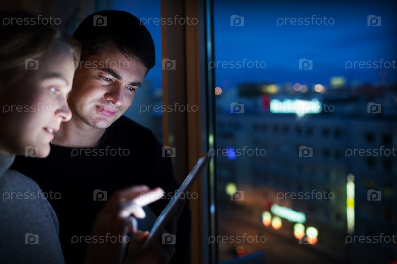 Друзья с планшетным ПК через окно