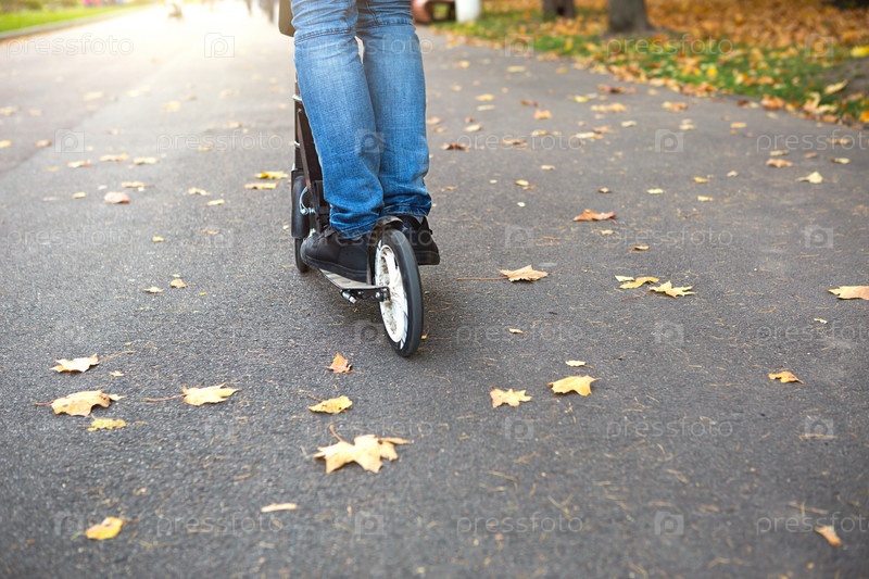 Ноги мужчины в джинсах и кроссовках на скутере в парке осенью с опавшими сухими желтыми листьями на асфальте. Осенние прогулки, активный образ жизни, экологически чистый транспорт, пробки