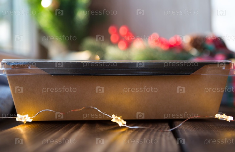 Рождественский декор бумажного пакета службы доставки еды на столе. Готовый заказ, экологически чистая перерабатываемая упаковка. Праздничное питание, изготовление десертов, печенья и сладостей домашнего приготовления. макет