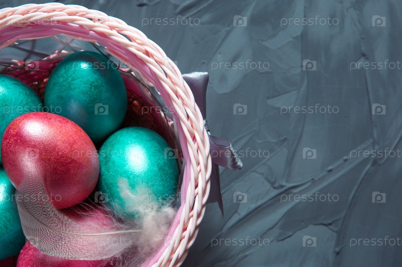Красочные окрашенные мраморные блестящие пасхальные яйца в корзине с нежными перьями крупным планом. Гнездышко с соломой - пасхальное украшение на стол